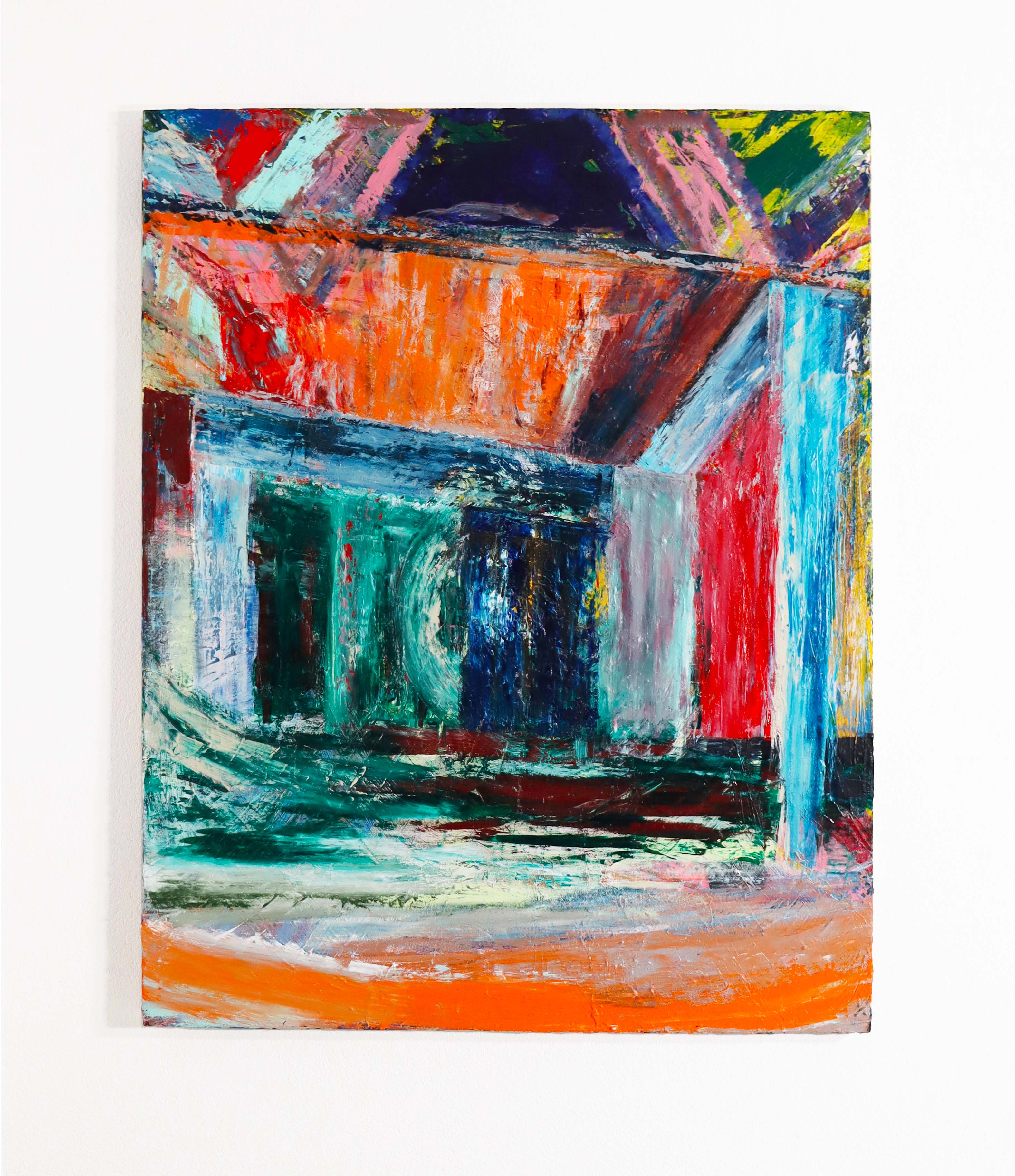 Les oeuvres sont initiées par l’urgence d’approcher et de matérialiser une forme de mystère qui habite certains lieux. La toile devient alors le théâtre de nombreuses peintures juxtaposées jusqu’à ce que l’obsession s’apaise et la vision se concrétise. La matérialité de la peinture, la touche ardente et les couleurs vives dialoguent avec une obscurité ambiante. Les motifs de la clairière, de la cathédrale et de l’espace architectural sont explorés dans les premières peintures jusqu’à ce que le corps et ses entrailles prennent toute la place. C’est alors que la matrice, le squelette, les organes et la chair se confondent, s’affrontent, s’adoucissent et transcendent.